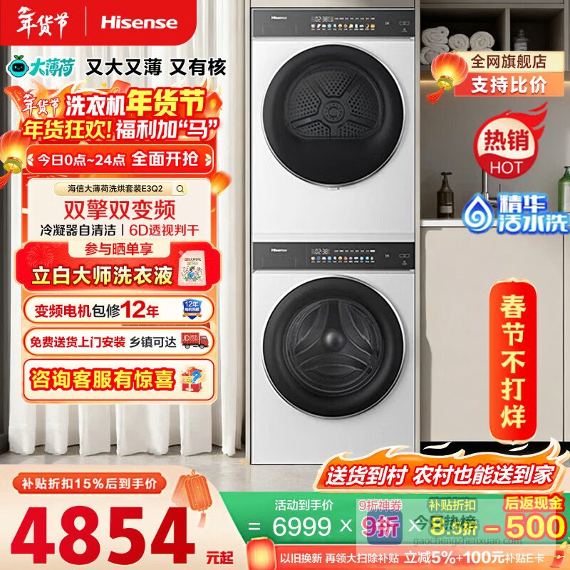 【京东自营】海信大薄荷洗烘套装10KG大筒径滚筒单洗洗衣机+热泵烘干机WF100E3Q1+E3Q1以¥