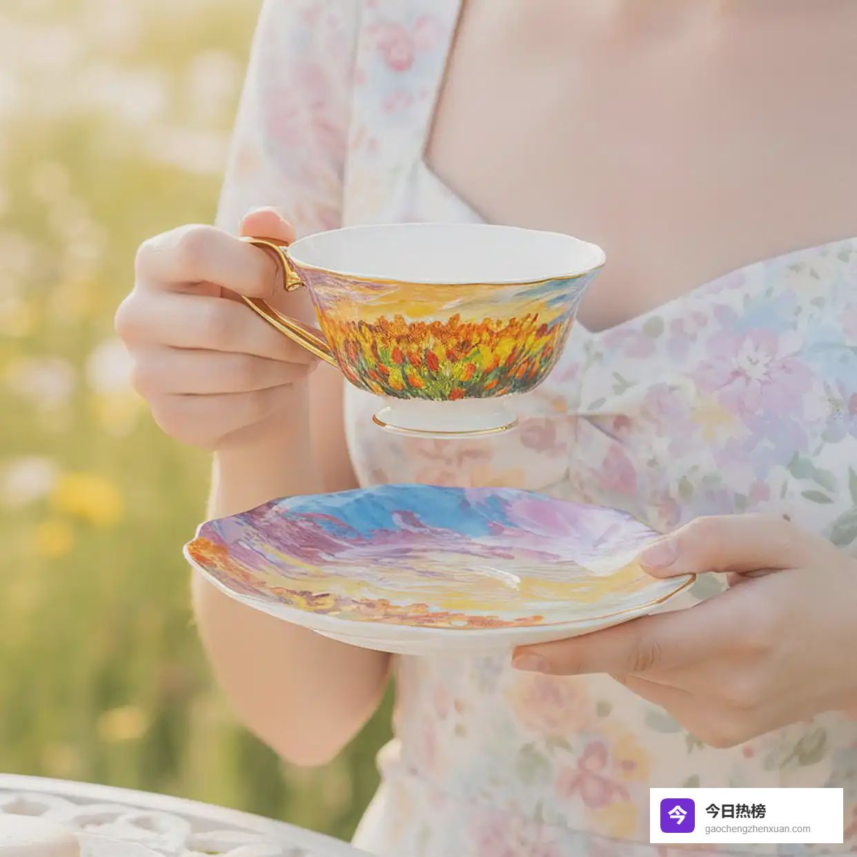 【商品推荐】2:AMIEENOR骨瓷咖啡杯茶具高档礼盒这款茶具的特别之处在于它把英式下午茶语境转化成了东方可用的器型语言——茶杯略高、杯身收腰明显,托盘绘有彩色花簇,仿佛把花园捧在掌心。金色边线勾勒轮廓,不是粗犷描边,而是纤细而精准的金属光泽,在光线下随角度微微流转,提升整套的呼吸感。