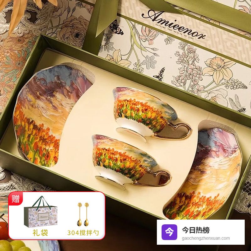 AMIEENOR骨瓷咖啡杯套装高档精致对杯英式下午茶具情侣生日礼盒结婚伴手礼 油画郁金香+油画郁金香 绿礼盒¥