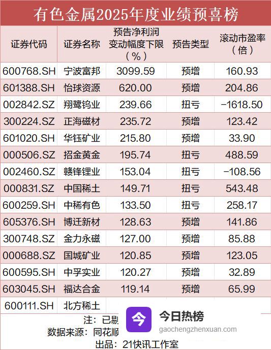 1月28日,21快讯记者注意到,今年以来,已有多家A股公司披露的2025年业绩“预喜”。其中,受有色金属涨价等因素影响,宁波富邦(600768.SH)净利润预计同比增长3099.59%至4379.43%,怡球资源(601388.SH)净利润预计同比增长620%到970%。