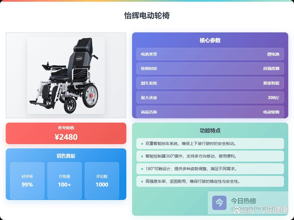 第1款:怡辉电动轮椅怡辉这款电动轮椅,车架用的是高强度碳钢,承重能力确实不错,能达到300斤,一般的体型都能满足。而且轴距设计也考虑到了操控性,转弯啥的应该比较稳当。另外,它这个脚踏是可以开合的,方便上下轮椅,细节上还挺贴心的。