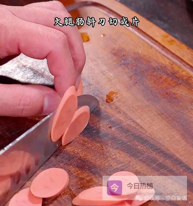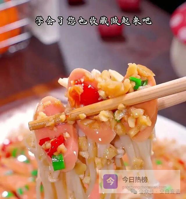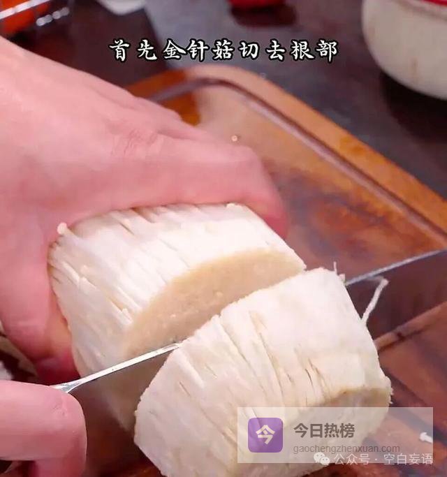 火腿.肠斜刀切.片.摆在金针菇上面。