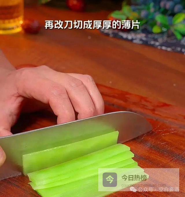第五道.凉拌莴笋丝,寓意健康.长寿,家庭富裕,香.辣脆爽,好吃又开胃。 .将莴笋切段切.成厚.薄片。