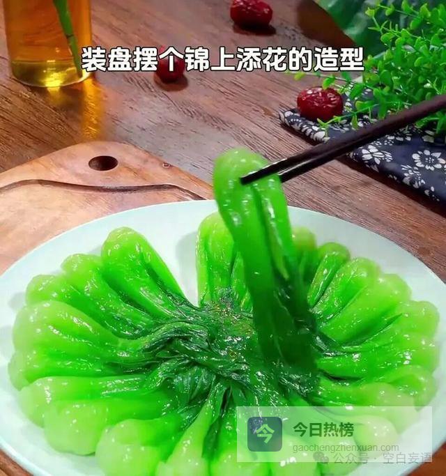 锅中水开.后加入盐和食用油,放入油菜焯水捞出,摆盘呈.锦上添.花的造型。