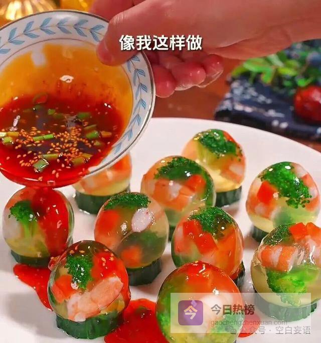 最.后一道蔬菜虾仁水晶蛋,晶莹.剔透,Q弹爽滑,颜值高味道好,堪称年夜饭餐桌上的.艺术品! .用器具破.开鸡蛋.壳。