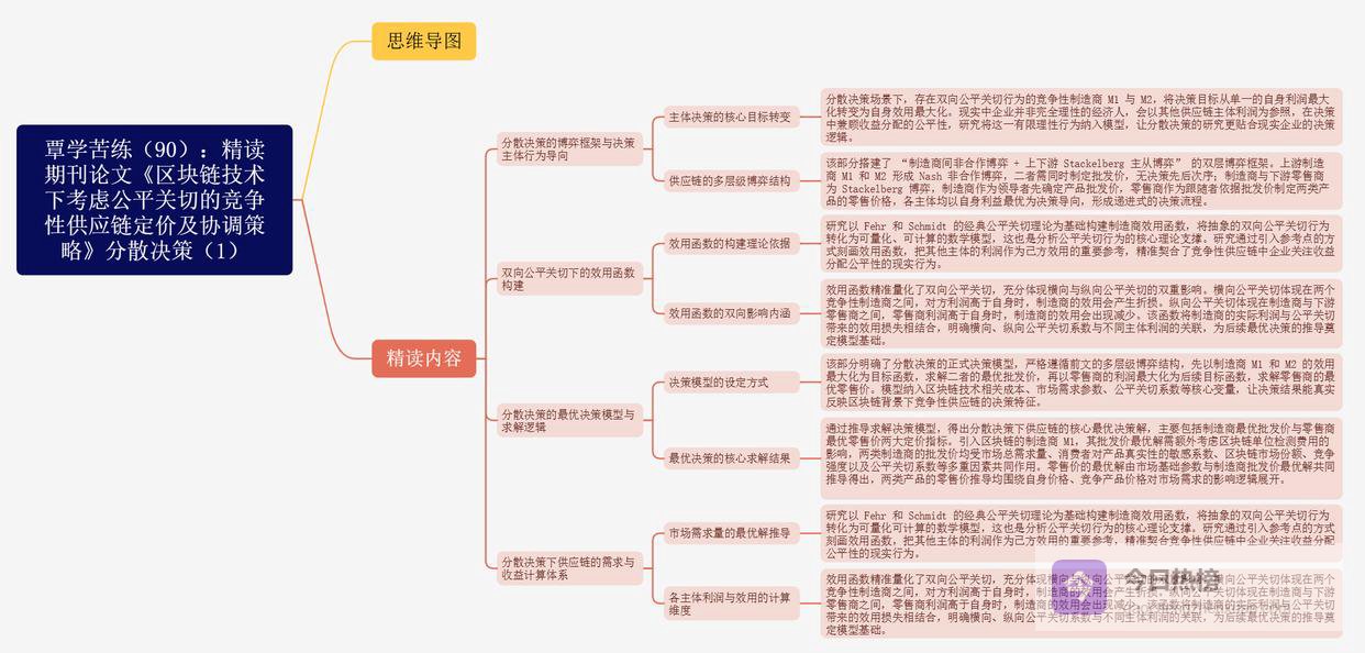 本文精读区块链技术下考虑公平关切的竞争性供应链分散决策双向公平关切部分,从博弈框架、效用函数构建、最优决策模型求解、需求与收益计算体系四大方面,剖析了该部分对分散决策下主体行为、模型构建、决策推导及收益核算的完整研究逻辑与核心内容。
