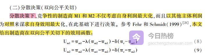 In decentralized decision-making scenarios, competitive manufacturers M1 and M2, exhibiting dual fairness concerns, shift their decision-making objectives from solely maximizing their own profits to maximizing their own utility. In reality, firms are not perfectly rational economic agents; they consider the profits of other supply chain entities as a reference, taking into account the fairness of profit distribution in their decisions. This study incorporates this bounded rationality behavior into the model, making the research on decentralized decision-making more closely aligned with the decision-making logic of real-world firms.