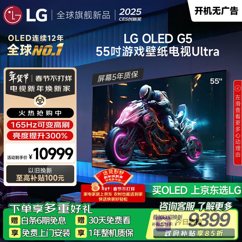 LG顶奢款G5系列 55英寸OLED电视艺术壁纸游戏电视超薄无缝贴壁165Hz高刷专业电竞显示器 O¥