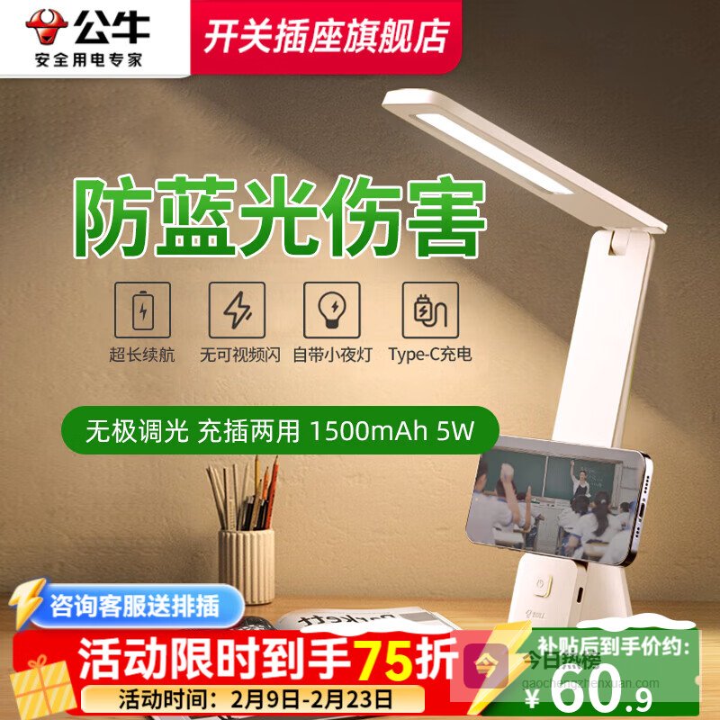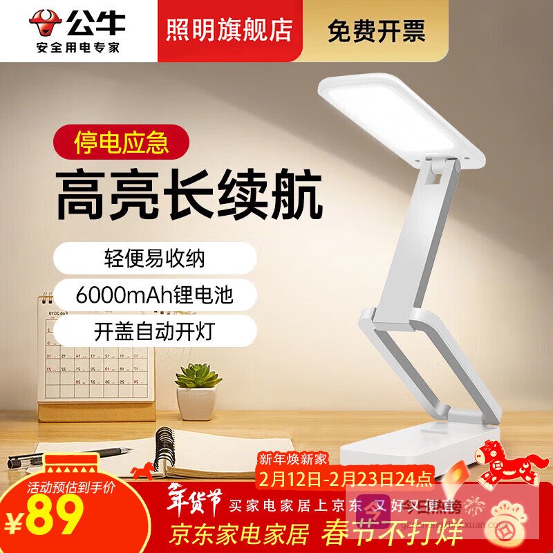 公牛(BULL)护眼台灯学生学习专用宿舍大学生卧室床头三折叠充电插电两用灯 6000mAh+调光调色¥
