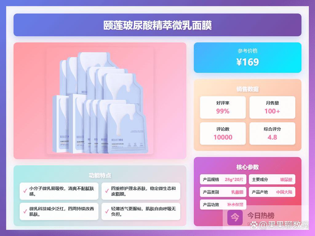 要说颐莲面膜怎么选,我觉得首先得搞清楚自己最想解决啥问题。如果你是干敏皮,追求温和修护,那颐莲玻尿酸精萃面膜准没错,它主打的就是舒缓镇静,让你的皮肤告别泛红敏感。要是你觉得皮肤特别干,恨不得一天敷八张面膜,那颐莲玻尿酸高保湿组合装绝对是你的菜,10重玻尿酸,给你的皮肤喝饱水,深层补水效果杠杠的。还有,如果你平时熬夜比较多,肤色暗沉,那可以试试颐莲玻尿酸水光肌原液,它能帮你修护受损肌肤,提亮肤色,让你的脸嘭起来,透出自然光泽。