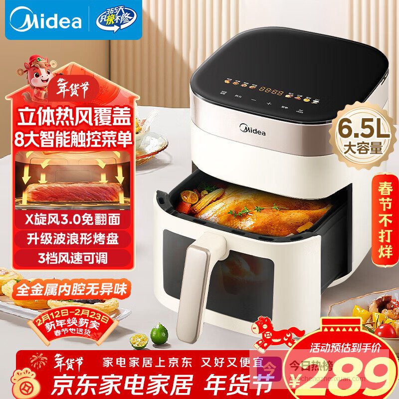 美的(Midea)家用免翻面空气炸锅蒸烤一体烤箱智能可视窗口大容量6.5L金属内腔热风循环KZC6517¥