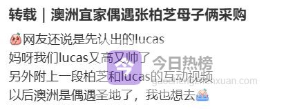 二月初,一位在悉尼生活的华人网友发视频说,自己在宜家买东西的时候,突然发现前面那位戴着棒球帽、口罩、扎高马尾的女人越看越眼熟,旁边还站着一个高高瘦瘦的少年。等反应过来,已经确定了:是张柏芝,和她的大儿子Lucas。