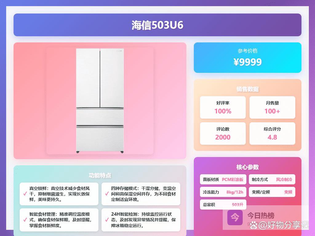 除了尺寸和容量,咱们还得关注保鲜技术。像海信503U6这种带真空分子级锁鲜技术的,能让食材保鲜更久,减少浪费。如果你对除菌比较在意,那海信BCD-508S3FZKQD的DBD离子主动除菌净味技术就挺靠谱的,能有效去除冰箱里的异味和细菌,保证食材的健康。当然啦,风冷无霜也是个加分项,省去了手动除霜的麻烦,像海信BCD-525WNK1PU就不错。总而言之,保鲜技术和除菌功能,直接关系到食材的新鲜度和健康,可不能马虎!