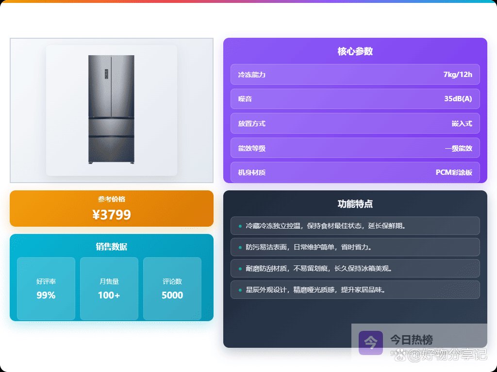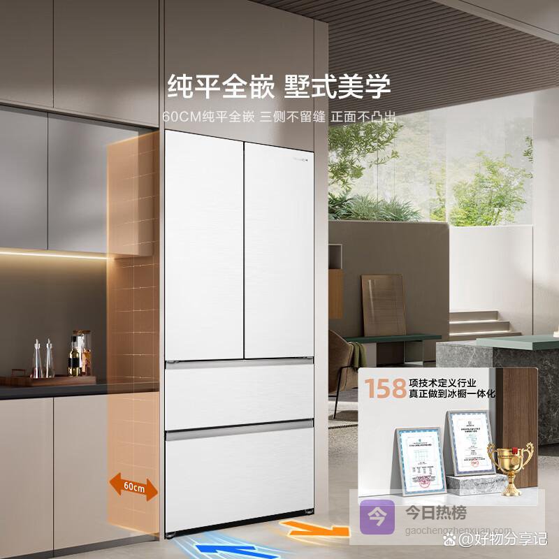 这款冰箱最大亮点就是超薄零嵌入设计,厚度只有59.8cm,跟橱柜贴得紧紧的,一点凸出都没有。摆在厨房里就像是天生的一部分,空间利用率提升不少,家里整洁感也跟着升一级。你要说它还挺省地方的,倒是挺适合想要极简风的厨房主。