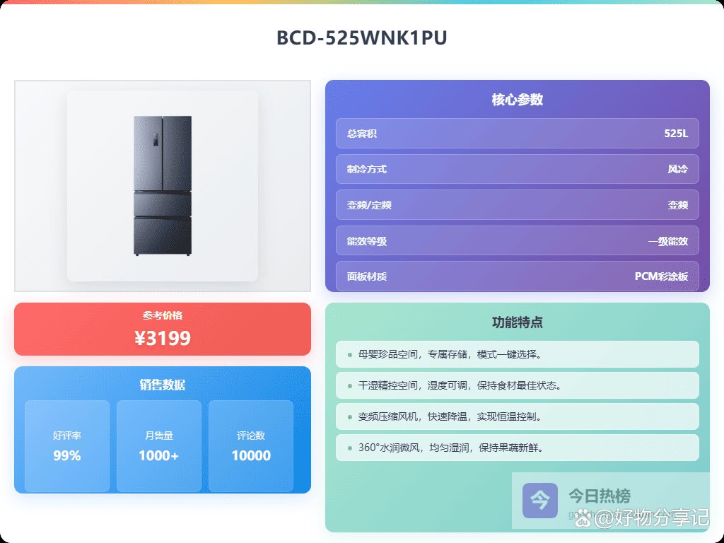 除了容积达到525升,冰箱的多温区控制和全空间净味技术也挺贴心的。干湿空间都可调节,保持食材新鲜又不串味,静音运行让你夜里睡得更香。整体设计现代大气,放哪都挺合适。