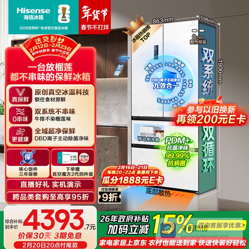 海信小榴莲500L法式多门冰箱真空保鲜双系统嵌入大容量一级能效净味风冷白色BCD-500V5FZKQD国家补贴¥