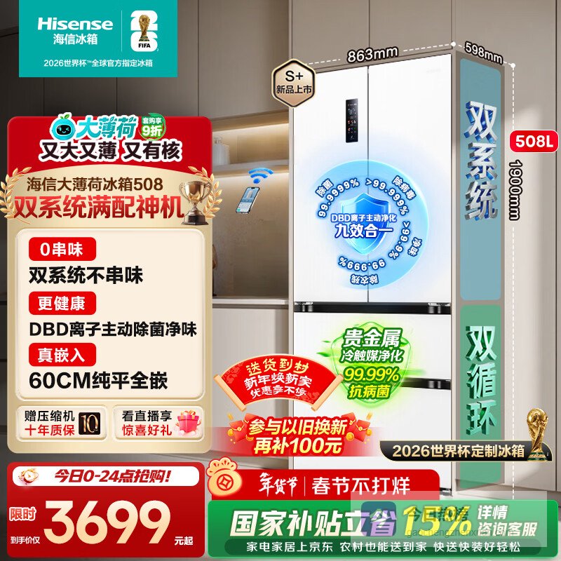 海信大薄荷508超薄零嵌入式法式冰箱四开门一级能效风冷无霜世界杯定制冰箱BCD-508S3FZKQD国家补贴 白色¥