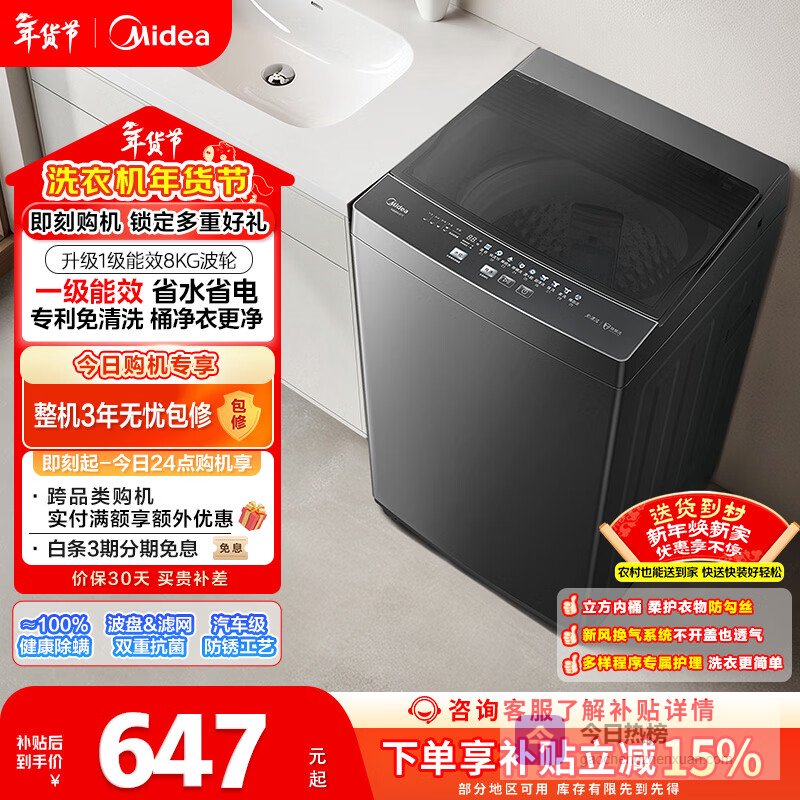 第3款:美的MB80V37T这款美的波轮洗衣机,8公斤容量基本能满足一家人的洗衣需求了。一级能效确实省电,能省下点电费。它家主打的专利免清洗技术,说是能用高压水流冲刷内外桶壁,减少污垢残留,这个设计还挺贴心的。