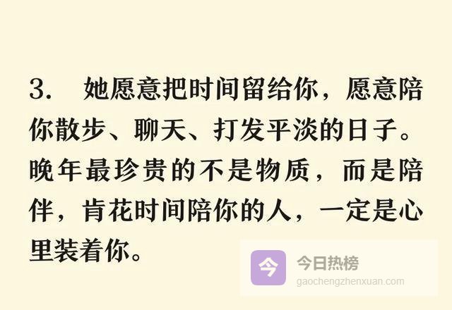她会为你调整作息,晚饭不急,等你下班;你的病历她都记得,一到复查就提醒你别忘了;遇到社区活动,主动问你要不要一起去,怕你孤单,也想给你面子;亲友聚会愿意带你去,让你认识她的圈子,等于把你拉进她的人生里;理财上不借你钱,也不让你借她钱,愿意一起讨论晚年花销,清楚划分,既信任也保护彼此;外出旅游不追景点,选离家近、体力能负担的线路,宁愿少跑一点,也要你舒服;她会把健康检查结果跟你分享,让你心里有数,也想得到你的意见;吃药时间贴在冰箱门上,让你能提醒她,也让你参与到她的节奏里。