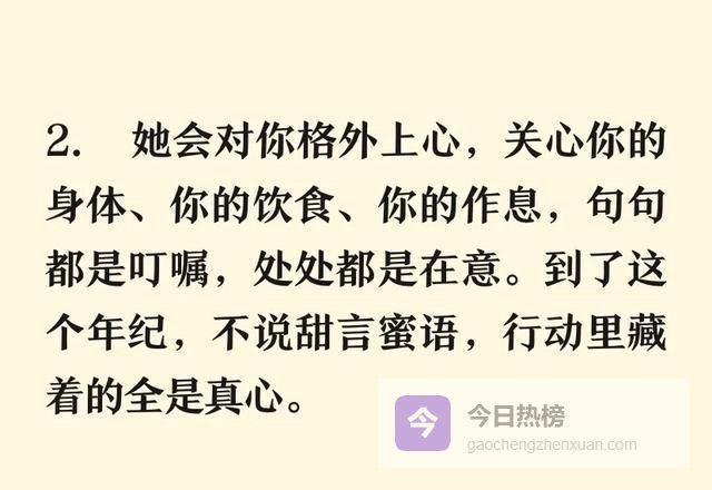 她会记你的胃口,买菜时多拿你爱吃的那一份,剩菜里把最好的留给你;出门看天气,宁可自己淋两滴雨,也把伞偏向你这边;你走路腿不快,她把步子放慢,过马路不催你,遇到台阶先把手伸出来;手机上不发长消息,清早一句问候,晚上一句到家没,不打扰,也不缺席;身上不舒服,第一时间想到你在不在,去医院让你作陪,但不让你跑前跑后,挂号她自己来,让你做她安心的后盾;家里有事,提前告诉你行程变化,让你别担心,关键时候会把钥匙给你,表示你可以随时进出;做大扫除,搬重物时不让你硬扛,安排方法让你省力,给你留面子也护你的身子。