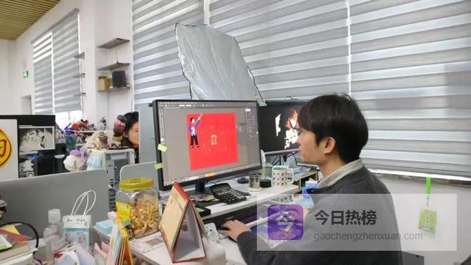 和传统农民画家不同,朱喜的创作工具除了画笔,更多的是电脑和平板。从文创产品到宣传海报,让金山农民画以更多元的形式走进大众视野。朱喜表示,自己最初是通过文创设计接触到金山农民画,这段工作经历也成为他学习农民画的起点,在工作中他慢慢摸索农民画的构图逻辑与色彩风格。