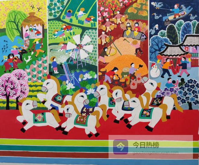 眼前这幅《八骏循时图》,出自金山农民画画家陈惠方之手。画中八匹骏马神态迥异、灵动飞扬,或奔腾跃动、或缓步前行,身后牵引出四季农事的流转,春耕、夏种、秋收、冬藏,蕴含着岁月轮回、生生不息的农耕智慧与人文情怀。陈惠方告诉记者,这幅作品是她创作生涯中尤为难忘的一笔,为这幅画构思的版本不少于十版,有好几个晚上甚至到深夜12点多,望着空白的画纸,她心里满是焦虑。某天凌晨2点半,她突然惊醒,脑海中豁然浮现出马的造型,最终她决定用民间美术来呈现。