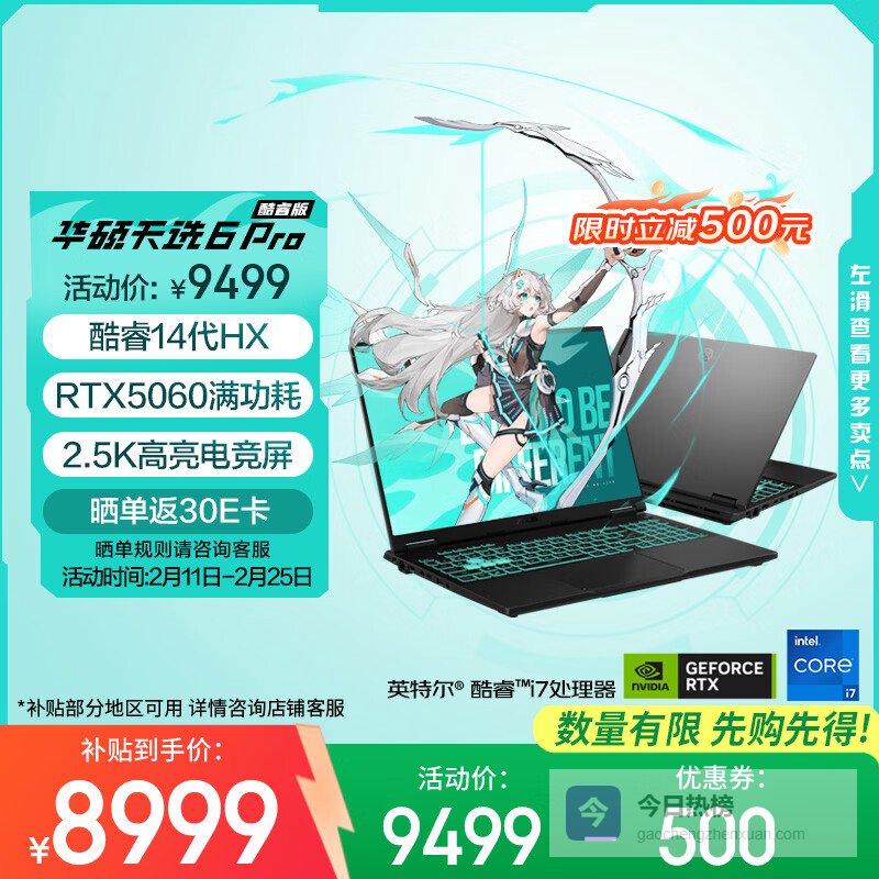 【京东自营】华硕天选6Pro酷睿版国家补贴16英寸游戏本笔记本电脑灰¥
