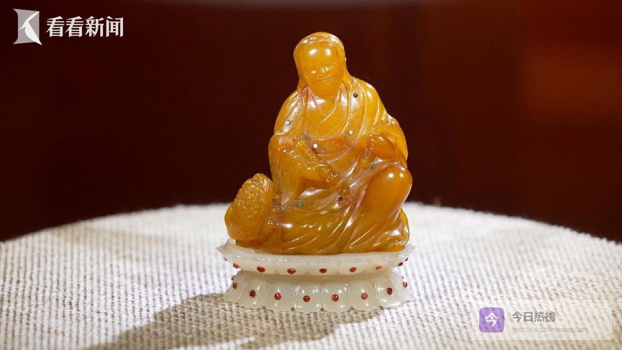 另一件珍贵展品是嵌于白玉莲花座上的“田黄罗汉”。这尊罗汉高7厘米,重137.4克,出自寿山石雕开山鼻祖杨玉璇之手,被誉为“江南第一田黄罗汉”。古语有云“一两田黄二两金”,可见其珍贵。像这样款式的田黄罗汉,目前所知仅在北京故宫、台北故宫和朵云轩三处可以看到。
