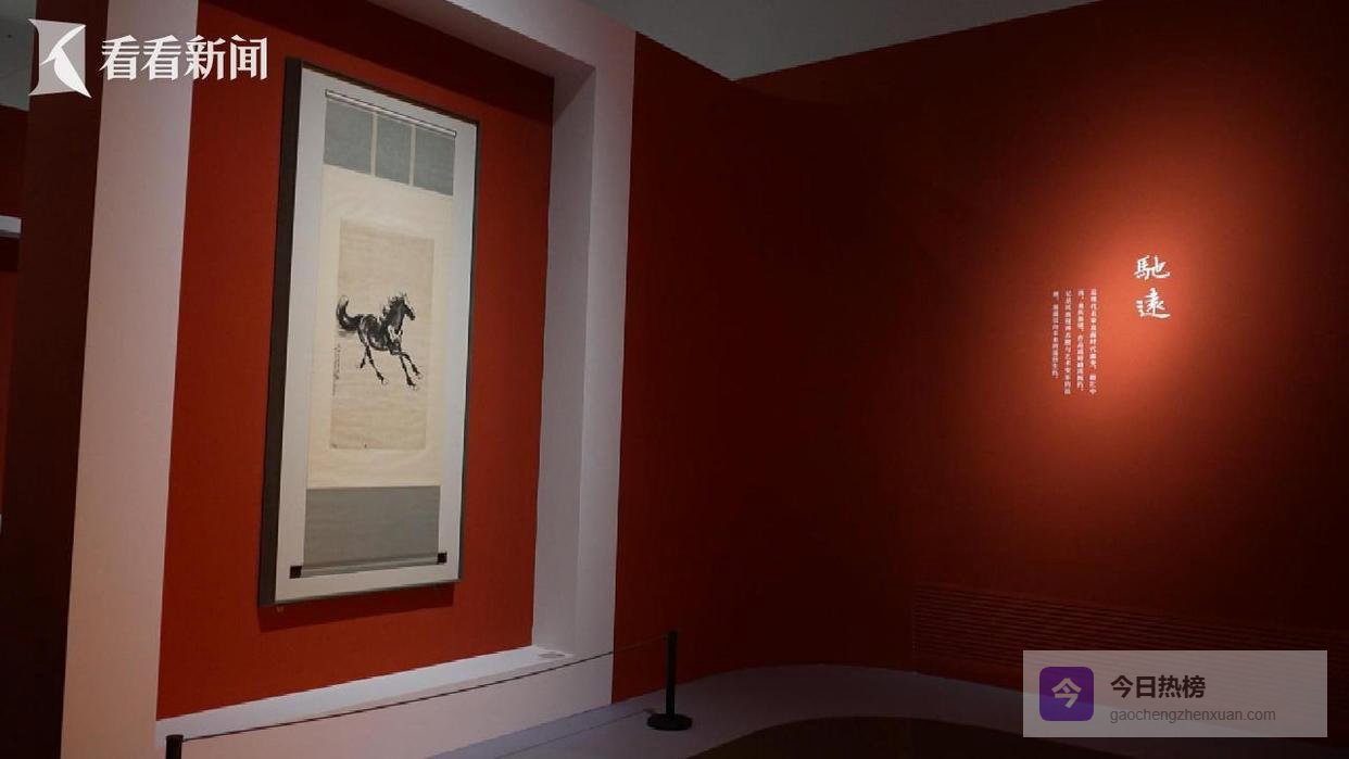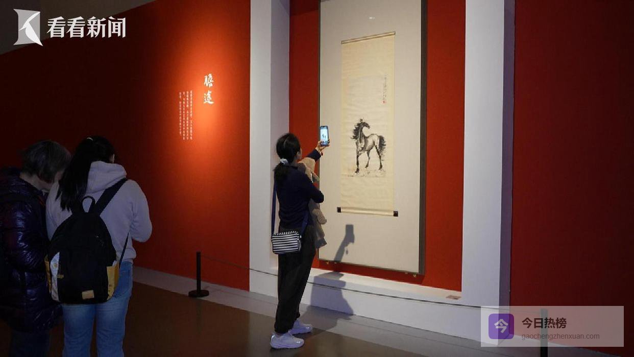 下午两点,展厅内迎来观展高峰。应和着马年新春,展览的四大篇章均以画坛巨匠徐悲鸿的奔马图为索引,引领观众步入跨越千年的书画文脉。率先映入眼帘的便是徐悲鸿的真迹《渊渟》:画面中,两匹骏马临水而立,神态安详,于静穆中传递出“饮水思源”的深远意境。