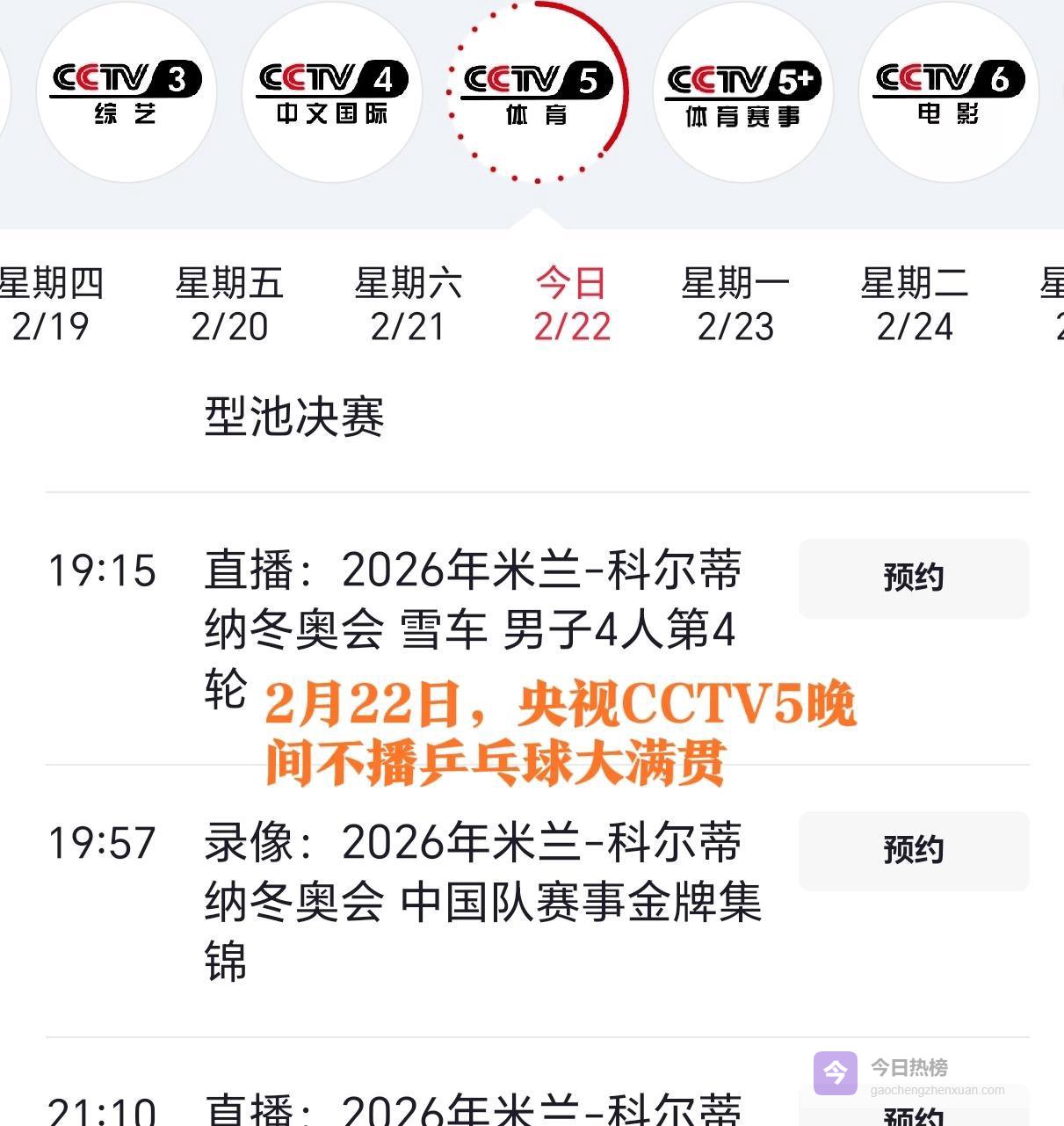 习惯性锁定CCTV5体育频道的观众,在2月22日这天晚上,将无法通过这个最主流的电视平台,看到世界排名第一的王楚钦登场冲击男单32强的比赛。 频道里传来的不是乒乓球撞击球台的声音,而是冬奥赛场上冰刀划过冰面的呼啸与滑雪板腾空的画面。