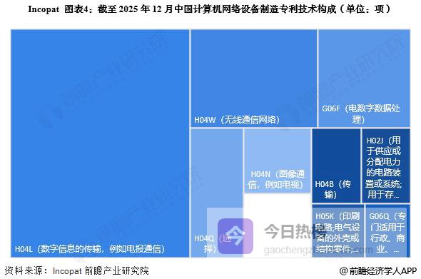 根据Incopat披露的数据显示,截至2025年12月,中国计算机网络设备制造专利重点关注H04L(数字信息的传输,例如电报通信)相关技术,共申请专利数量达到54874项;其次是H04W(无线通信网络),共申请专利数量16936项。