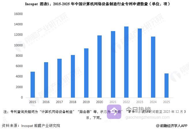 根据Incopat披露的数据,2015-2024年中国计算机网络设备制造专利申请数量总体上升。2022年中国计算机网络设备制造行业专利申请数量达到13596项,达到近年来最高值;2025年截至12月,专利申请数量为4654项。