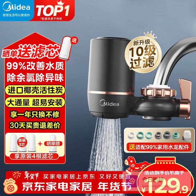 美的(Midea)净水器水龙头过滤器家用自来水滤水器直饮前置过滤器厨房卫生间通用除水垢除余氯双出水可清洗滤芯 一机三芯【两年免换滤芯】¥