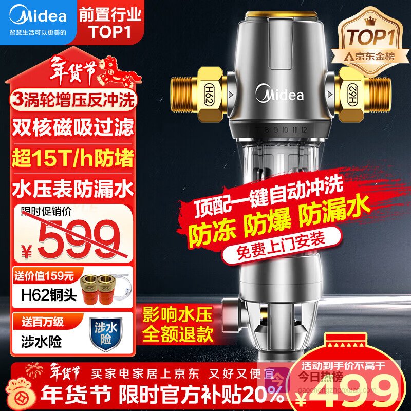美的(Midea)前置过滤器智能全自动清洗涡轮正反冲洗家用净水器净水机前十名防爆 QZBW20S-22S 旋风¥