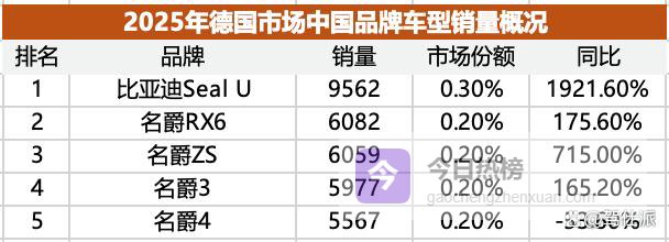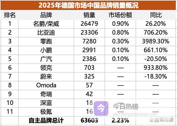 中国品牌2025年在德国市场的总销量6.36万辆,在德国市场仅占2.23%的份额,销量最高的是上汽旗下的荣威/名爵,全年总销量2.65万辆,同比增长了26.2%。