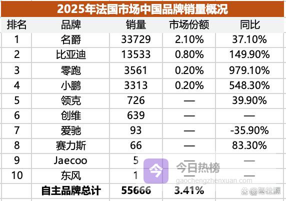 在法国市场,中国品牌2025年总销量达到5.57万辆,占据当地3.4%市场份额,略高于在德国市场的份额,但依然明显低于欧洲平均。