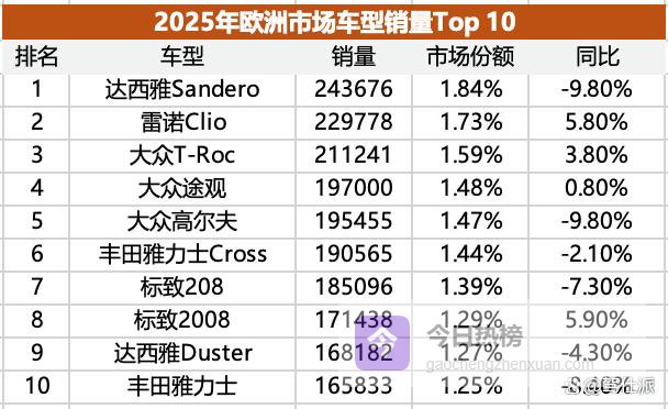 车型方面,2025年欧洲市场有3款车型销量超过20万辆,分别是达西雅Sandero、雷诺Clio和大众T-Roc,都是尺寸较紧凑的两厢车或SUV。整个Top 10畅销车型中,尺寸最大的是排名第四的大众途观。