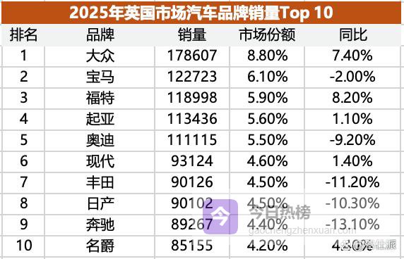 2025年名爵在英国市场成功挤入品牌Top 10,销量8.5万辆,同比增长4.4%,占据当地4.2%的市场份额。
