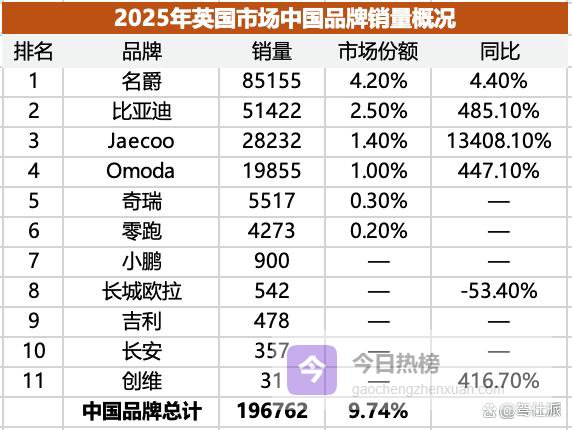 中国品牌在英国市场的总销量达到19.7万辆,市场份额达到9.7%,已经远高于中国品牌在欧洲整体市场的水平。