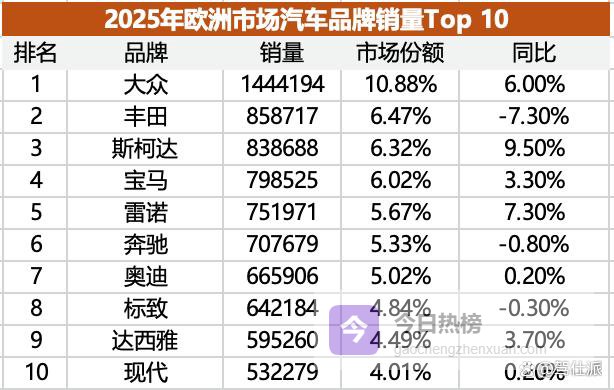 大众品牌在欧洲市场最为强势,2025年以144.4万辆占据10.9%市场份额,销量同比增长了6%。丰田和大众排名只差一位,但销量直接就掉到了85.9万辆,市场份额6.5%,同比下滑了7.3%。