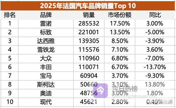 2025年法国新车总销量163.2万辆,是欧洲第三大市场,同比下滑了5%,是50年以来最低水平。
