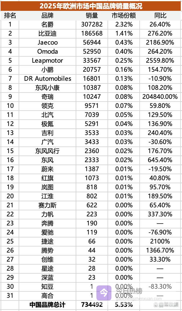 在如此繁重的税率之下,中国品牌2025年在欧洲市场的总体销量达到73.4万辆,占据5.5%的市场份额,且在榜的绝大多数品牌,都实现了两位数、三位数甚至四位数的同比增幅。