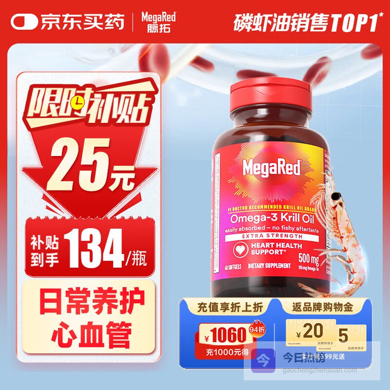 MegaRed脉拓南极磷虾油软胶囊深海鱼油omega-3日常护血管高纯度500mg40粒¥