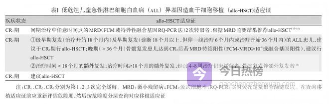 异基因造血干细胞移植(Allo-HSCT)是治疗儿童难治复发ALL的有效手段。国际及国内均已发布相应的指南共识。目前国内移植共识(参考2022年版)涵盖的主要适应症包括:低危组、中危组移植适应证分别见表1、表2,而所有被纳入高危组的患儿均建议Allo-HSCT。