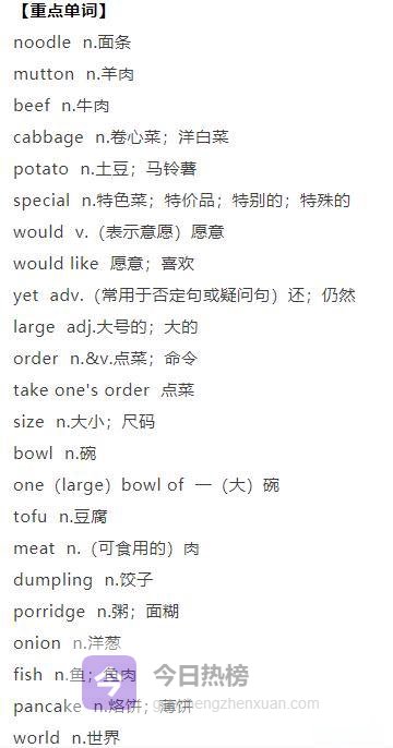 ▣ Unit 9 美食点单全攻略核心词汇:beef noodles, dumplings, fish, orange juice, onions, green tea, porridge