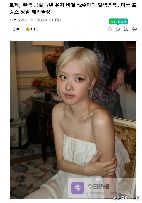 就在3月2日,韩国媒体曝光了一个大瓜,给Rosé、宣美等顶级韩星做造型的知名发型师车钟贤(ChaCha),在自己的YouTube频道上,罕见揭秘了Rosé维持金发的内幕,这投入和频率,真的远超普通人的想象。