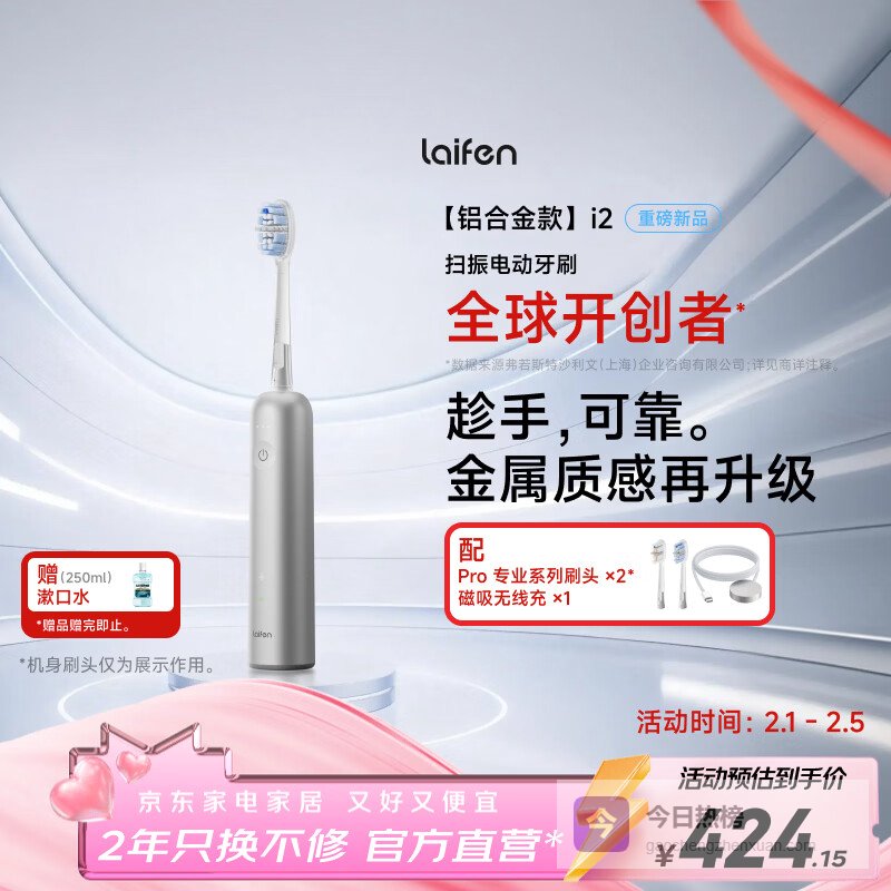 徕芬徕芬二代扫振电动牙刷 i2铝合金款 莱芬清洁护龈成人牙刷 焕新升级款银色 生日情人节年会企业礼物¥