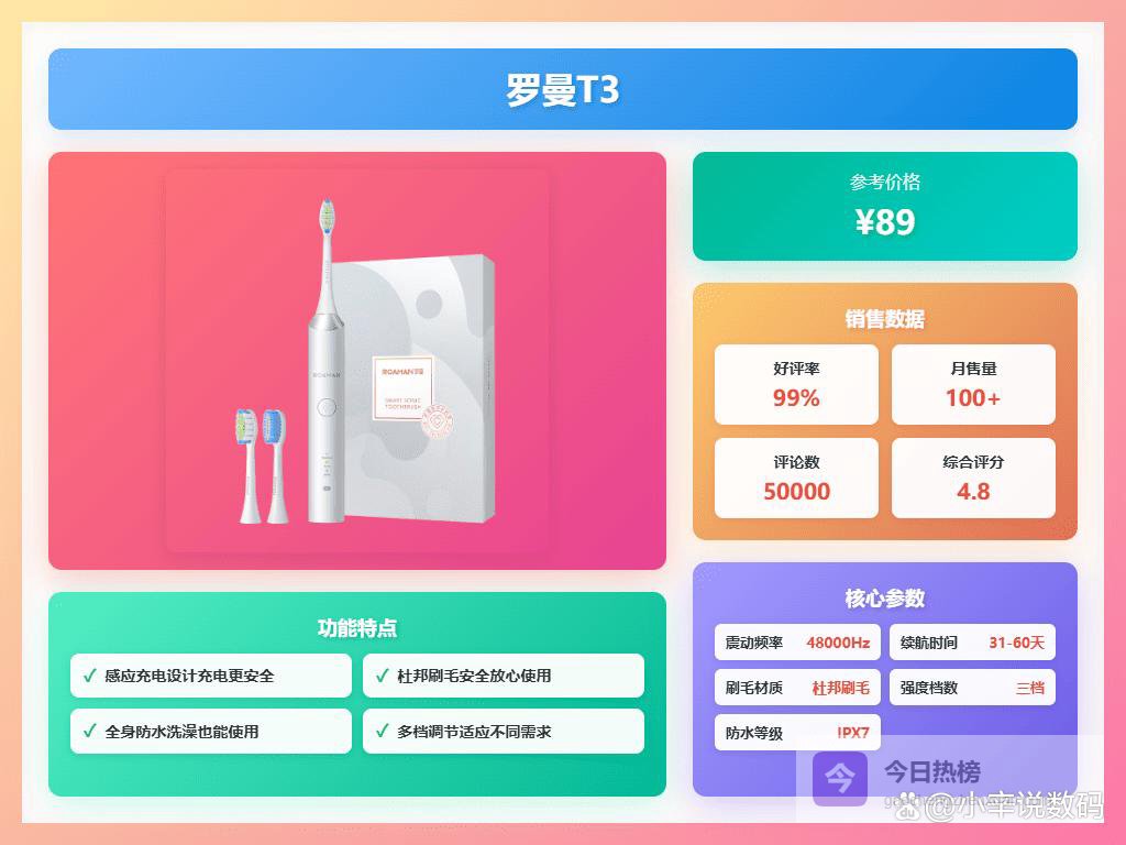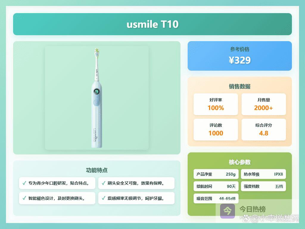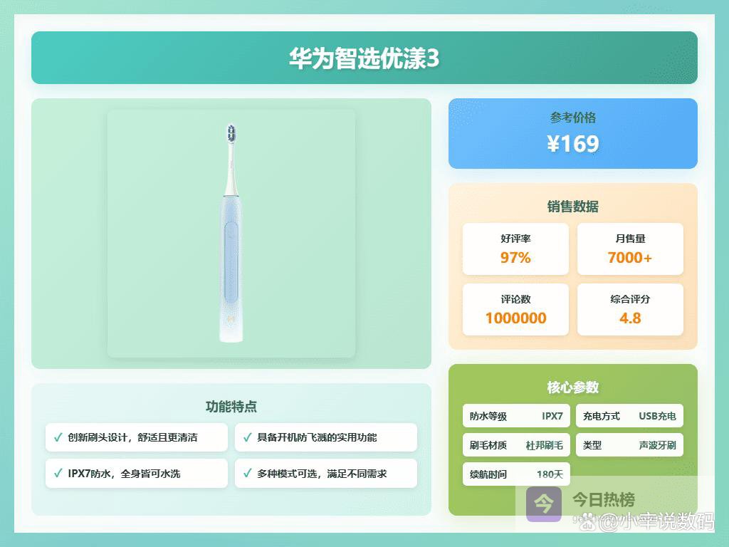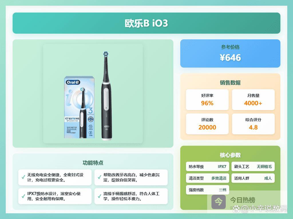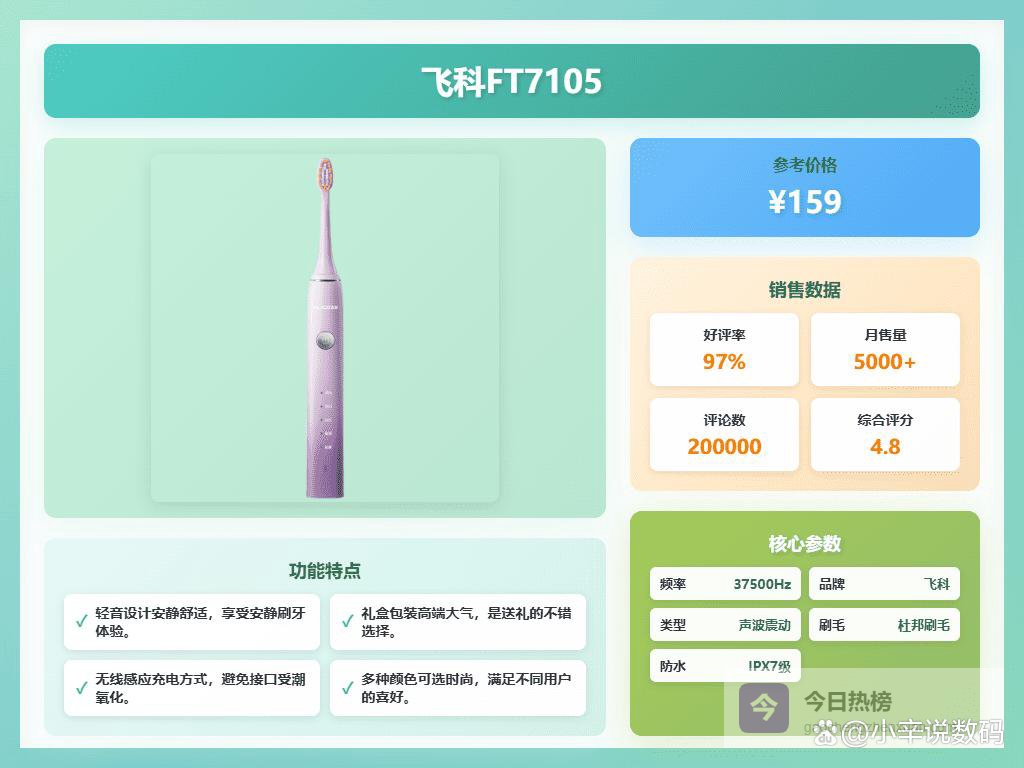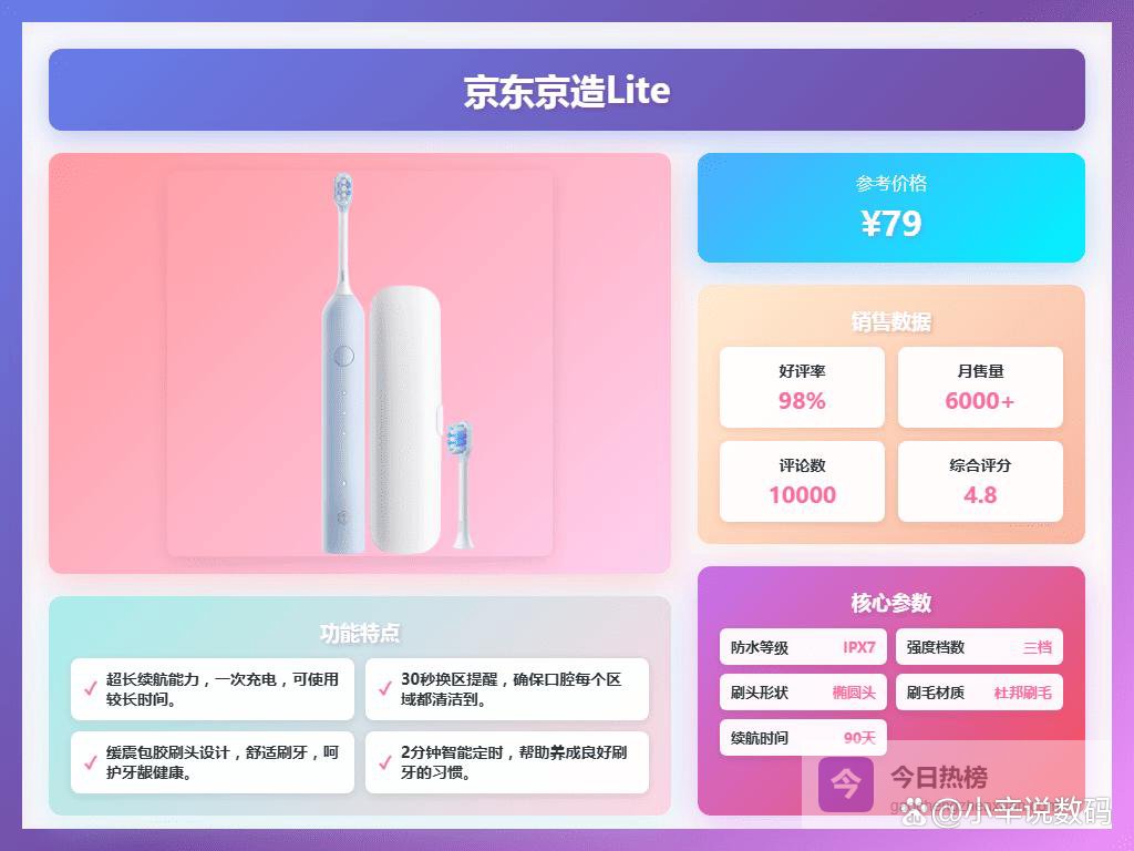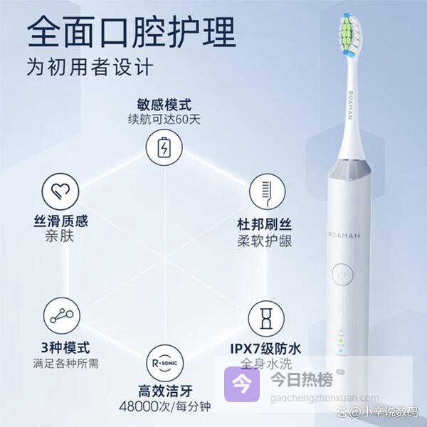 当然,除了这些硬指标,还有一些小细节也值得关注。比如,看看它是不是全身防水,方便清洗。再比如,有没有智能定时功能,确保你每次刷牙都达到标准的2分钟。还有,如果经常出差或者旅行,最好选一个带便携盒的,方便携带。另外,现在有些电动牙刷还支持APP连接,可以记录你的刷牙数据,帮你更好地了解自己的口腔状况。最后提醒一句,性价比也很重要哦! 别盲目追求大牌,选择一款适合自己的,才是最好的!