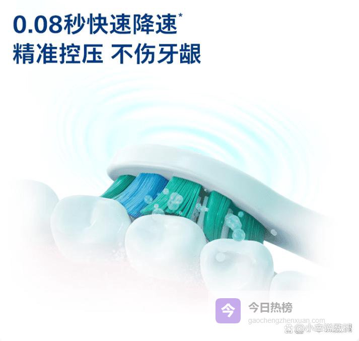 【智能护牙功能】这款牙刷有压力感应和换刷头提醒,用起来还不错,能自动检测你刷牙的力度,避免用力过猛伤害牙龈。尤其是过压提醒灯,告诉你别太用力,保护牙齿和牙龈更放心。临床数据显示,连续使用一段时间后,口腔健康会明显改善,牙龈更健康,牙渍也更少。