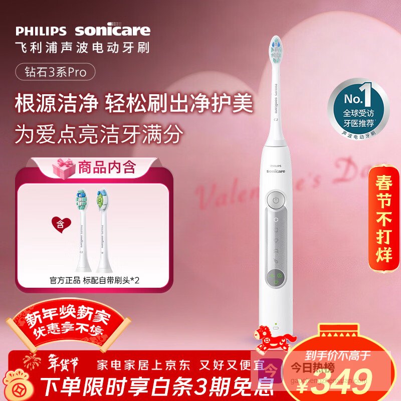 飞利浦(PHILIPS)【肖战推荐】声波电动牙刷钻石3系Pro年货节礼物 情人节情侣款送男生/女友深层清洁HX5272/03白色¥